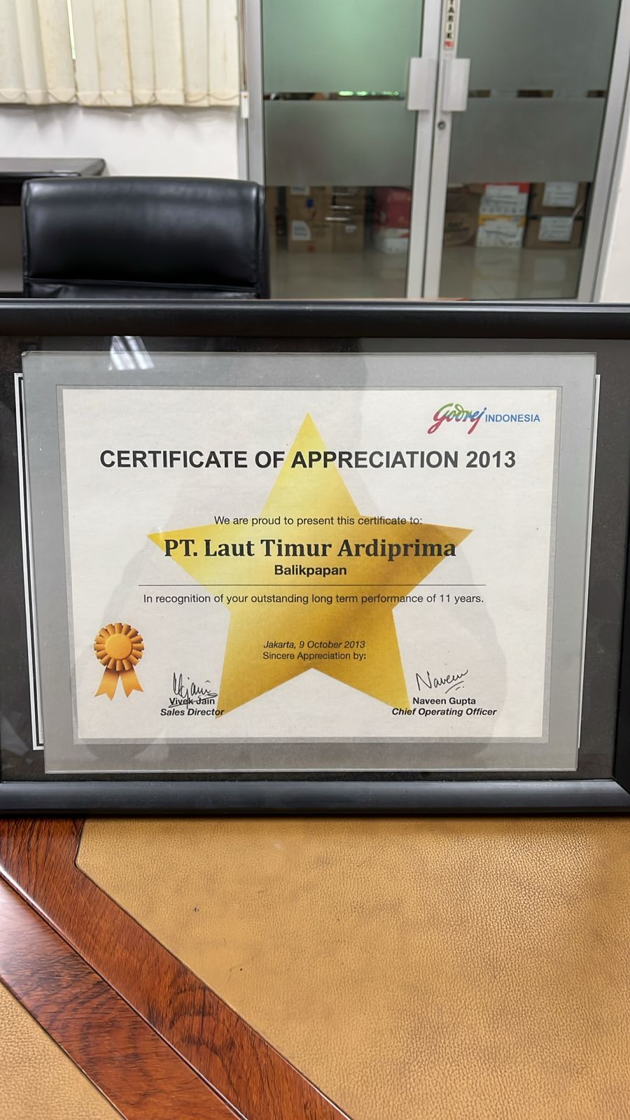 Certificate of Appreciation to PT. Laut Timur Ardiprima (Balikpapan) in recognition of outstanding long term performance of 11 years