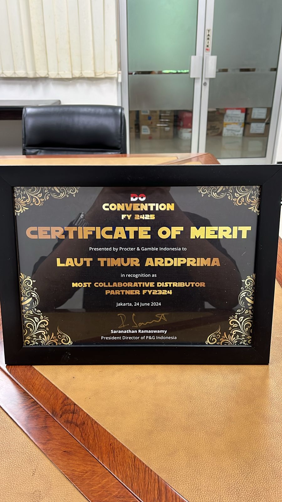 Certificate of Merit presented by Procter & Gamble Indonesia to Laut Timur Ardiprima in recognition as Most Collaborative Distributor Partner FY2324