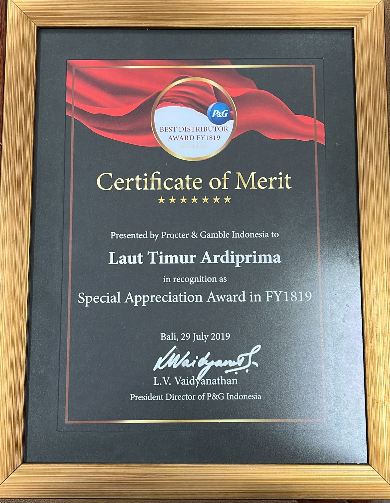 Certificate of Merit presented by Procter & Gamble Indonesia to Laut Timur Ardiprima in recognition as Special Appreciation Award in FY1819