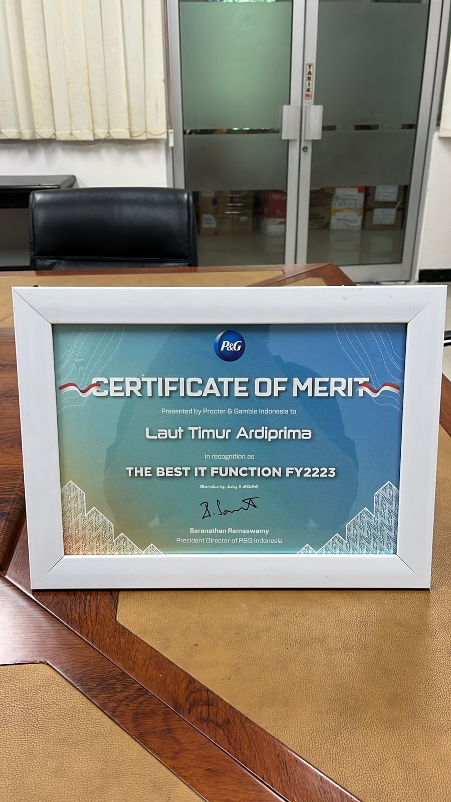 Certificate of merit presented by Procter & Gamble Indonesia to Laut Timur Ardiprima in recognition as The Best IT Function FY2223