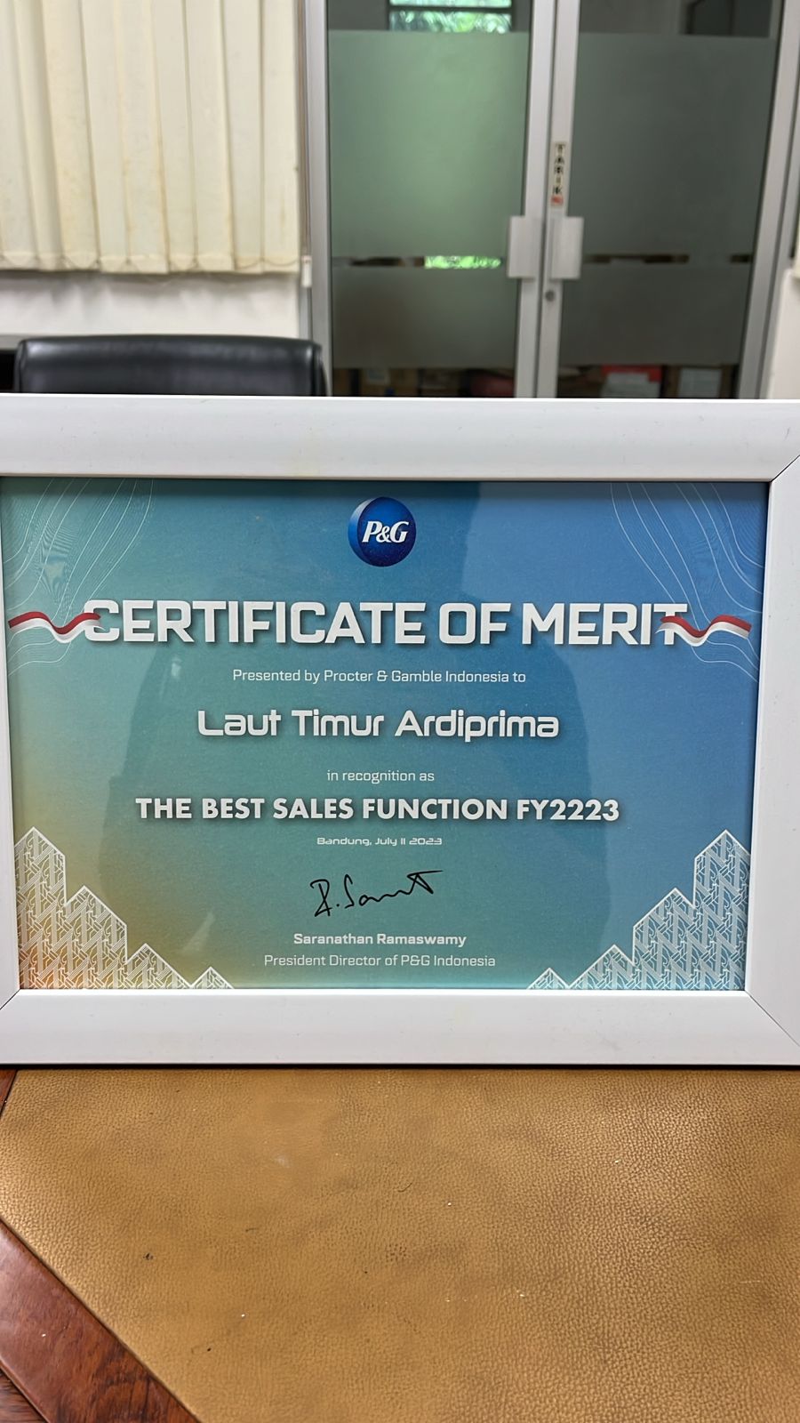 Certificate of merit presented by Procter & Gamble Indonesia to Laut Timur Ardiprima in recognition as The Best Sales Function FY2223